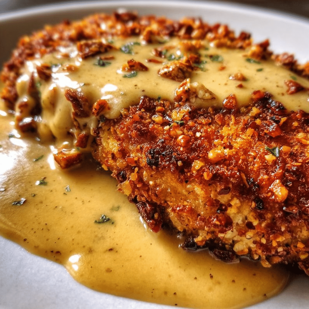 Pretzel Chicken with Mustard-Cheddar Sauce Delight